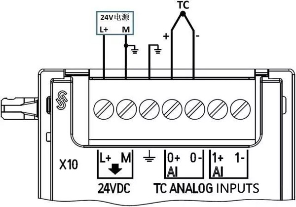 熱電偶測量溫度的基本原理是:兩種不同成份的材質導體組成閉合回路,當兩端存在溫度梯度時回路中就會有電流通過,此時兩端之間就存在電動勢。S7-200 SMART EM TC模塊可以測量J、K、T、E、R&S和N型等熱電偶溫度傳感器,具體型號請查閱《S7-200 SMART系統手冊》。TC模塊的接線說明參考圖7 TC信號接線。