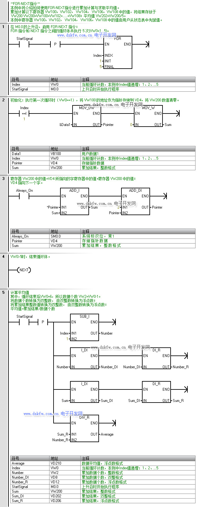 通過 FOR-NEXT 指令,對 5 個變量:VW100、VW102、VW104、VW106、VW108 進行求和,求和結果放到 VW200 中,計算的平均值存放在 VD210 中 。梯形圖實例如下: