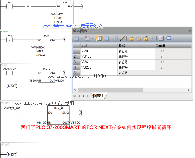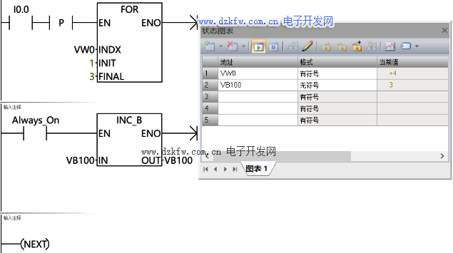 當I0.0為ON時接通一個上升沿脈沖觸發FOR指令EN端循環3次,VB100值等于3。