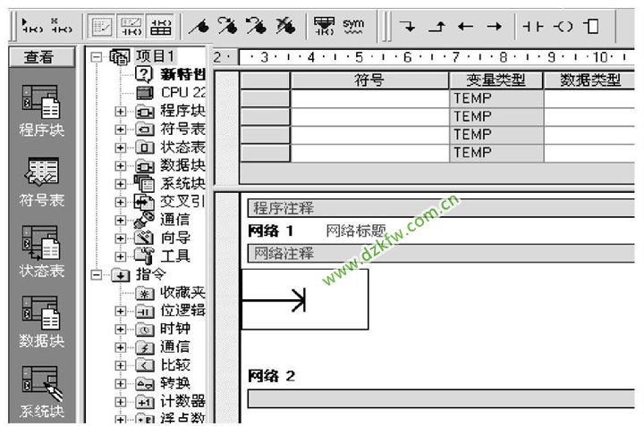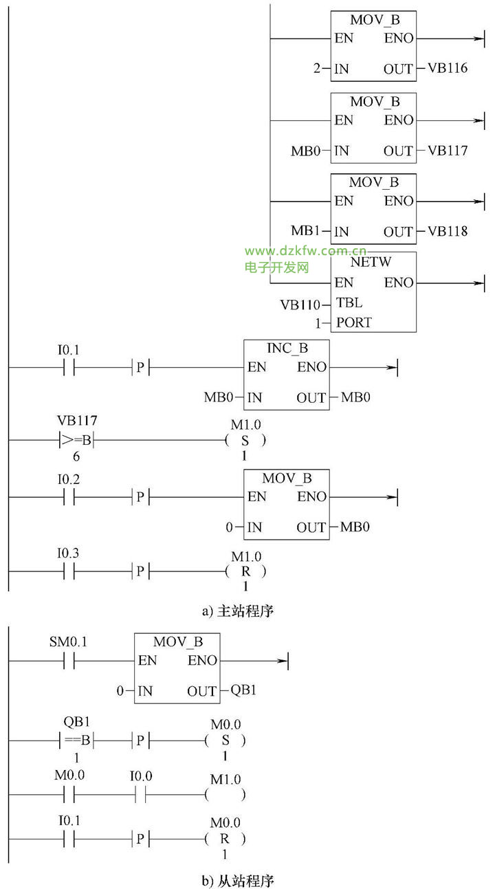 這是兩臺(tái)PLC主從式通信的例子,通過(guò)這個(gè)例子可以了解兩臺(tái)PLC間通信都應(yīng)建立哪些初始化程序,主站怎樣讀取從站的數(shù)據(jù)又怎樣將自己的數(shù)據(jù)寫(xiě)到從站中去,數(shù)據(jù)的通信是以變量寄存器為通道來(lái)實(shí)現(xiàn)的,這些寄存器不是唯一的,但只要建立了第一個(gè),后面的就要緊隨其后連續(xù)使用(也就是說(shuō)成組使用)。這個(gè)例子想達(dá)到的控制目的是在主站中用I0.1作為輸入信號(hào)建立一個(gè)字節(jié)加1指令,送給從站的輸出口顯示出來(lái),同時(shí)在主站中也累計(jì)數(shù)據(jù)變化過(guò)程,當(dāng)數(shù)累加到6時(shí),主站再給從站一個(gè)信號(hào),從站接到這個(gè)信號(hào)后用從站(自己的)輸入信號(hào)I0.0發(fā)給主站輸出口一個(gè)點(diǎn)動(dòng)信號(hào)。整個(gè)過(guò)程能說(shuō)明只要建立好初始化關(guān)系,主站輸入信號(hào)的邏輯關(guān)系能夠控制從站的輸出,反過(guò)來(lái)從站的輸入信號(hào)也能控制主站的輸出。像這個(gè)例子當(dāng)中有個(gè)限制條件,就是只有當(dāng)主站給從站的數(shù)累加到6以后,從站發(fā)給主站的信號(hào)才有效,在這之前主站是接不到從站信號(hào)的。