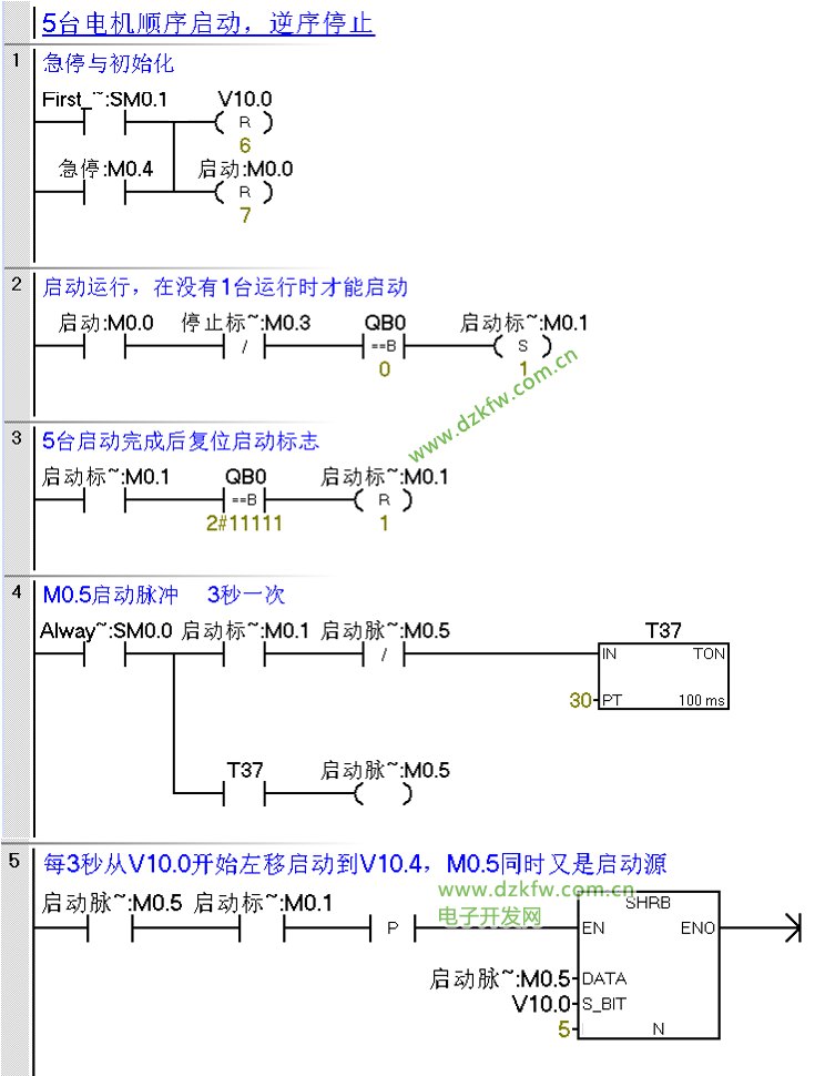 1、5臺電機每3秒啟動一臺,順序啟動從Q0.0-Q0.4.