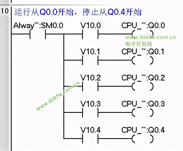 2、停止時要求逆序停止,從Q0.4-Q0.0,間隔時間3秒。