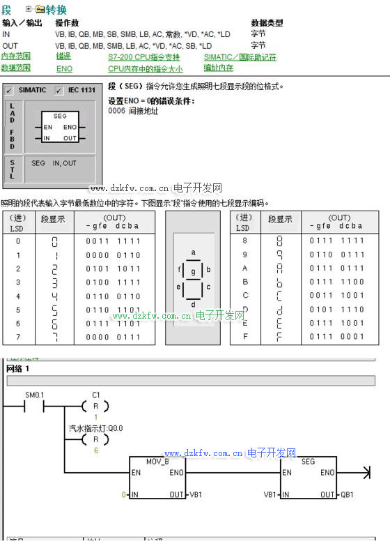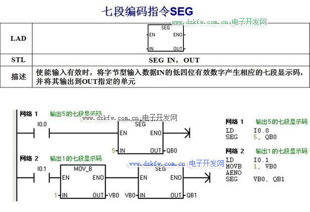 西門子有SEG指令,該指令是專為數碼管而設計,只要把一個數字賦值給接好線的輸出字節,就可以直接輸出,非常方便,指令如下所示.但要求是接線必須按照下圖的要求接線.否則無法使用.