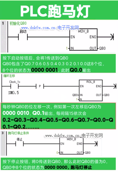 使用SM0.5(每0.5秒觸發一次,周期1秒)+沿脈沖(上升沿P)+循環左移字節指令(ROL_B)QB0—QB0左移一位。