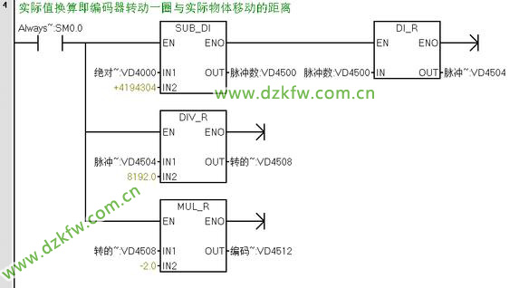 4.計算實際體的位移值,比如說編碼器轉動一圈會產生一個脈沖數的變化,根據這個脈沖數的變化與實際的位移進行一個換算,這樣可以將物體實際產生的位移在PLC內部計算出來。大家可以看下這個實例的的功能。看看能不能推出來,編碼器轉動一圈的脈沖數和實際的位移。