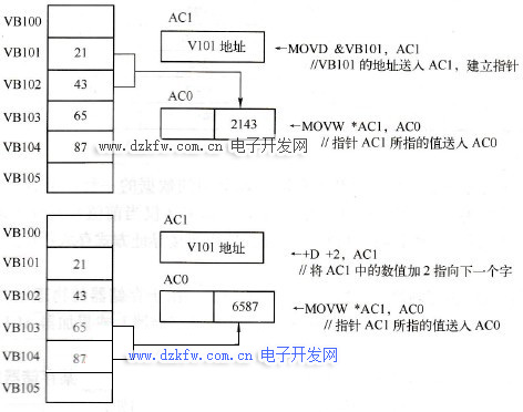為了生成指針,必須用雙字傳送指令( MOVD)將要間接尋址的某存儲器的地址裝入用來作為指針的編程元件中,裝入的是地址而不是數(shù)據(jù)本身。例如,