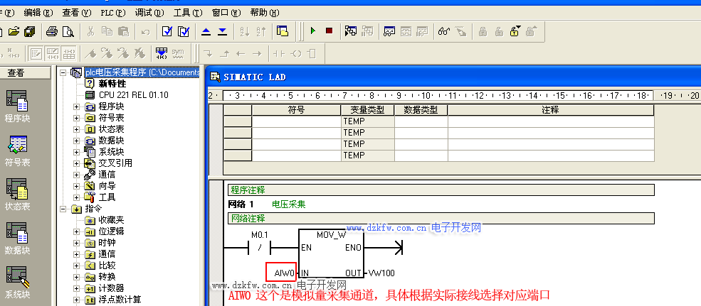 采用STEP7-Micro/win編程軟件編寫PLC程序,實現S7-200PLC模擬電壓的采集,并將采集到的電壓值(數字量形式)放入寄存器VW100中。
