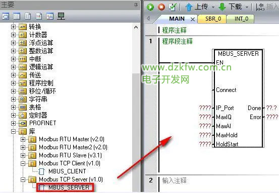 2、鼠標點擊 MAIN 主程序的程序段1的編程區域,從庫文件夾下找到 Modbus TCP 服務器指令 MBUS_SERVER,鼠標雙擊,指令出現在程序段1中,操作如圖所示。