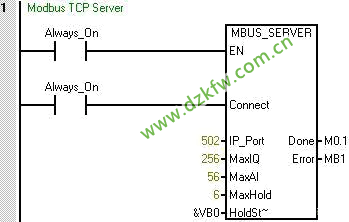 程序執行周期每次掃描都必須調用 MBUS_CLIENT,直到 Done 輸出為 TRUE。在每個周期中,MBUS_CLIENT 均會退出,以便程序可以繼續運行。客戶端完成請求時,MBUS_CLIENT 將 Done 設置為 TRUE。