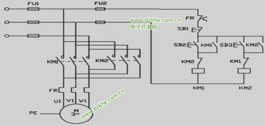 為反轉(zhuǎn)控制按鈕。KM1、KM2常閉觸點(diǎn)相互閉鎖,當(dāng)按下SB2正轉(zhuǎn)按鈕時(shí),KM1得電,電機(jī)正轉(zhuǎn);KM1的常閉觸