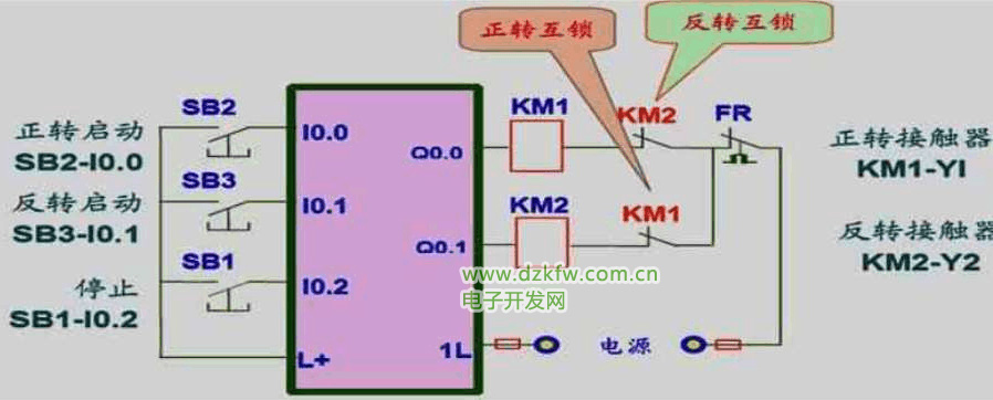 電器接入PLC的輸出端。注意正轉(zhuǎn)、反轉(zhuǎn)控制繼電器必須有互鎖。