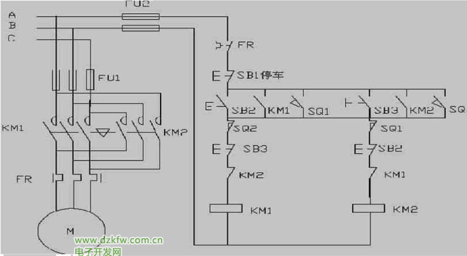在該控制線路中,KM1為正轉(zhuǎn)交流接觸器,KM2為反轉(zhuǎn)交流接觸器,SB1為停止按鈕、SB2為正轉(zhuǎn)控制按鈕,SB3