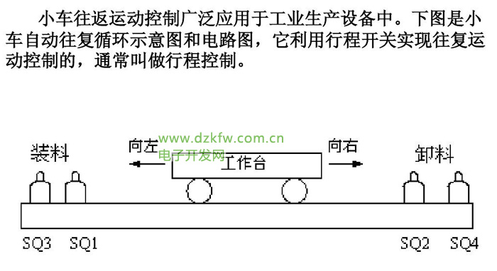 按鈕,小車從左邊往右邊(右邊往左邊運(yùn)動(dòng))當(dāng)運(yùn)動(dòng)到右邊(左邊)碰到右邊(左邊)的行程開關(guān)后小車自動(dòng)做返回運(yùn)動(dòng),當(dāng)碰到另一邊的行程開關(guān)后又做返回運(yùn)動(dòng)。如此的往返運(yùn)動(dòng),直到當(dāng)按下停車按鈕后小車停止運(yùn)動(dòng)。