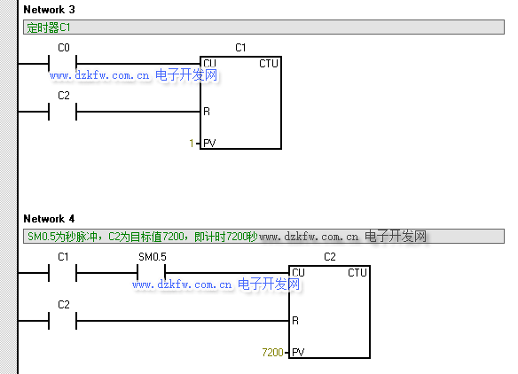 設計思路:通過斷開計數器去接通下一個計數器,再加一個SM0.5一秒鐘接通一次,相當于加時間1秒1秒在計時,計7200s=120min=2h即為斷
