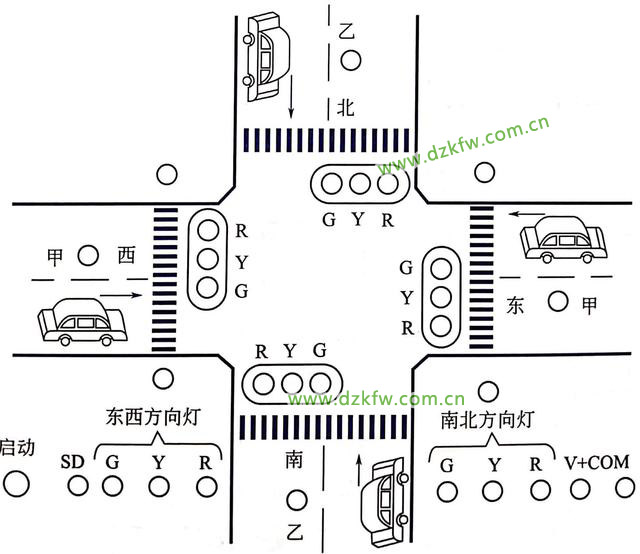 開(kāi)關(guān)在十字路口實(shí)現(xiàn)紅黃綠交通燈的自動(dòng)控制,南北方向紅燈亮的時(shí)間為50S,黃燈亮3S,綠燈亮的時(shí)間為42S,綠燈閃爍時(shí)間為5S;東西方向的亮燈時(shí)間與南北方向規(guī)律一致。