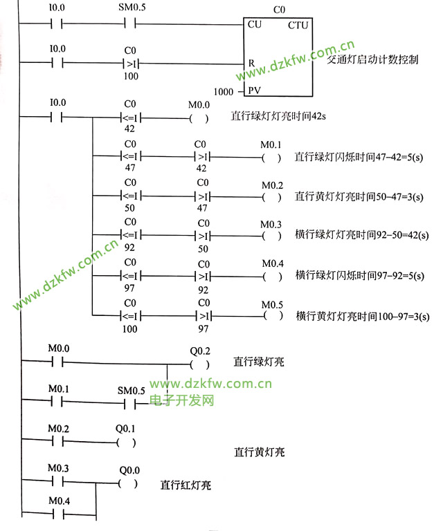 1⃣️:合上交通燈啟動(dòng)按鈕,啟動(dòng)程序,程序運(yùn)行瞬間,SM0.5產(chǎn)生一個(gè)正向脈沖,計(jì)數(shù)器C0開(kāi)始計(jì)數(shù)。2⃣️:計(jì)數(shù)值C0≤42時(shí),M0.0得電導(dǎo)通,Q0.2、Q0.3得電,直行綠燈閃亮,橫行紅燈亮.......依次類(lèi)推。
