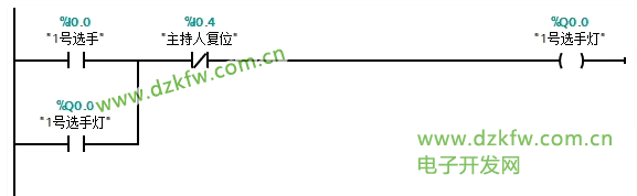 如圖,只有當2號選手、3號選手、4號選手都沒有搶答的時候,1號選手才能點亮自己的燈;如果有一個人搶答,例如4號選手,那么當4號選手燈點亮后,其常閉觸點斷開,能流永遠無法通過,直至主持人開啟新一輪搶答。其他只有當2號選手、3號選手、4號選手可以參考1號選手的梯形圖程序進行編寫,就可以得出一個四路搶答器的梯形圖程序。