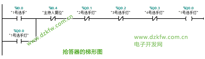 這個搶答器的題目很經典,其實就是自鎖和互鎖的應用首先是選手搶答,對于選手來說,他按下按鍵,就應該亮起他的燈當他松手的時候,燈應該保持亮著那么就是一個按鍵自鎖
