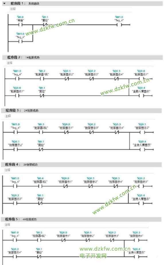 系統程序設計及運行過程如下:當主持人摁下開始按鈕時,信號就傳入PLC中,四個搶答席就進入搶答狀態。當有某個隊摁下搶答按鈕時,系統會判斷出哪個隊率先搶答成功。具體實施步驟:在程序段2中,搶答器1隊搶答成功時,系統搶答繼電器通電自鎖,本隊搶答器繼電器和其他參賽隊按鈕輸入觸點串聯的常開觸點斷開,保證了搶答的準確性。搶答繼電器閉合后,主持人席的顯示裝置被點亮,代表主持人席和其他搶答隊都可以看到搶答結果。