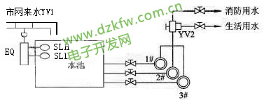 本節介紹一個三泵生活/消防雙恒壓無塔供水的實例。如圖9-10所示,市網自來水用高低水位控制器EQ來控制注水閥YV1,自動把水注滿儲水水池,只要水位低于高水位,就自動往水池注水。水池的高/低水位信號也直接送給PLC,作為高/低水位報警。為了保證供水的連續性,水位上下限傳感器高低距離較小。生活用水和消防用水共用三臺泵,平時電磁閥YV2處于失電狀態,關閉消防管網,三臺泵根據生活用水的多少,按一定的控制邏輯運行,維持生活用水低恒壓。當有火災發生時,電磁閥YV2得電,關閉生活用水管網,三臺泵供消防用水使用,維持消防用水的高恒壓值。火災結束后,三臺泵再改為生活供水使用。