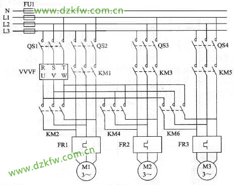 FR1、FR2、FR3分別為三臺電機過載用的熱繼電器;QS1、QS2、QS3、QS4分別為三臺泵電機主電路的隔離開關;FU1為主電路的熔斷器;VVVF為通用變頻器。