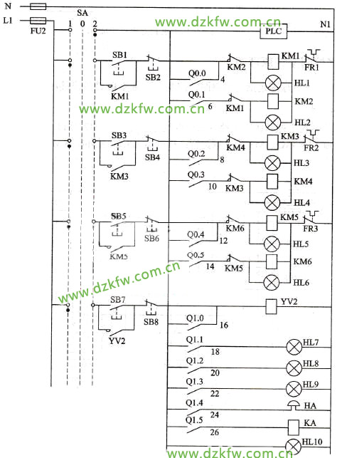 圖中HL10為自動運行狀態電源指示燈。對變頻器進行復位時只提供一個干觸點信號,由于PLC的4個輸出點為一組且共用一個COM端,而本系統又沒有剩下單獨的COM端輸出組,因此通過一個中間繼電器KA的觸點對變頻器進行復頻控制。圖9-13中的Q0.0~Q0.5及Q1.0~Q1.5為PLC的輸出繼電器觸點,它們旁邊的4、6、8等數字為接線編號,可結合圖9-12一起讀圖。