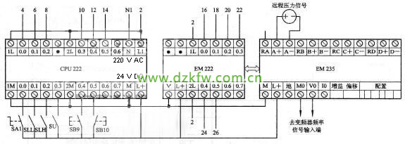 圖9-14 恒壓供水控制系統PLC及擴展模塊的外圍接線