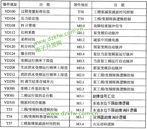 系統初始化的一些工作放在初始化子程序中完成,這樣可節省掃描時間。利用定時器中斷功能實現PID控制的定時采樣及輸出控制。主程序的功能最多,如泵切換信號的生成、泵組接觸器邏輯控制信號的綜合及報警處理等都在主程序中。生活及消防雙恒壓的兩個恒壓值是采用數字方式直接在程序中設定的。生活供水時系統設定值為滿量程的70%,消防供水時系統設定值為滿量程的90%。在本系統PID中,只是用了比例和積分控制,其回路增益和時間常數可通過工程計算初步確定,但還需要進一步調整以達到最優控制效果。初步確定的增益和時間常數為: