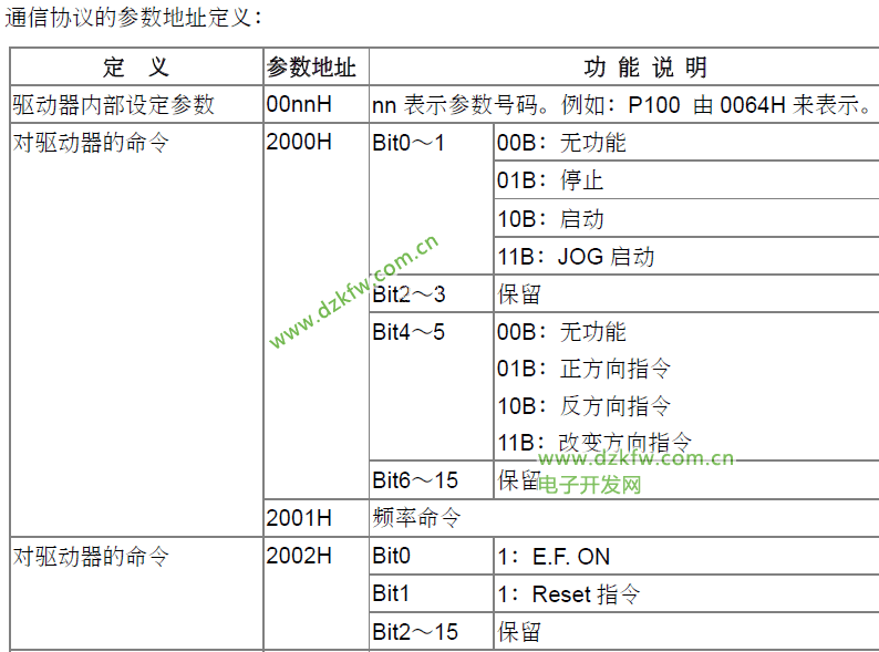 在控制命令2000H 的地址中,每個位置的含義已經定義好了,Bit2-3和Bit6-15保留,即為0,Bit0-1和Bit4-5表示啟動及運行方向,若電動機以反向點動運行,則Bit0-1設置為11,1, Bit4-5設置為10,最終得到2#10011。將2#10011 通過通信傳輸到變頻器的2000H中,變頻器將會按照設定的方式工作。