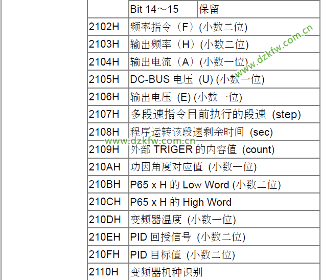上表中的2102H頻率指令(F)( 小數2位)中,小數2位的含義是指:頻率范圍是00.00 -50.00Hz, 頻率是一個實數,但是一個實數占用32位,Modbus通信的保持寄存器區每次通信的單位是字,并不能直接傳輸小數。因此在通信過程中我們讀到的頻率信息是放在兩個字里邊的,第一個字中存儲的是一個 4位十進制數,例如0612,但是我們都知道,頻率并沒有0612Hz,我們還要讀取第二個字中的值,第二個字中的值表示小數點的位數,例如2,表示小數的位數為2位,,因此當前的運行頻率表示為06.12Hz,這才是我們真正讀到的頻率值。
