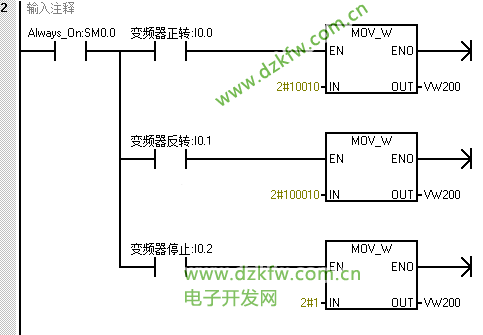 第二步:(按下I0.0命令值寫入VW200變頻器電機正轉、按下I0.1命令值寫入VW200變頻器電機反轉、按下I0.2命令值寫入VW200變頻器電機停止)