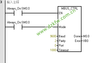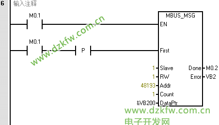 第六步:(M0.1接通寫入變頻器運行指令,VW200中頻率值寫入變頻器當中,寫入完成后M0.2接通)