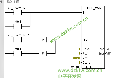 第四步:(SM0.1首次接通寫入變頻器頻率指令,M0.4用輪詢方式循環寫入頻率,VW100的頻率值寫入變頻器當中,寫入完成后M0.1接通)