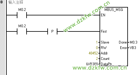 第八步:(M0.2接通讀取變頻器頻率指令,讀取變頻器頻率值存放在VW300當中,讀取完成后M0.3接通)
