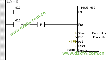第十步:(M0.3接通讀取變頻器電流指令,讀取變頻器電流值存放在VW400當中,讀取完成后M0.4接通)