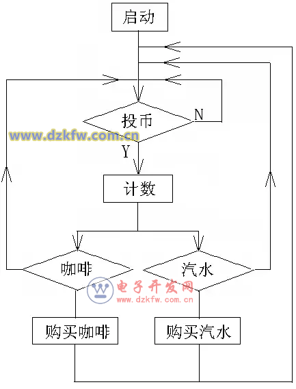 3. 售貨機內的二種飲料有相對應價格,當投入的貨幣大于等于其售價時,對應的汽水指示燈C、咖啡指示燈D點亮,表示可以購買。