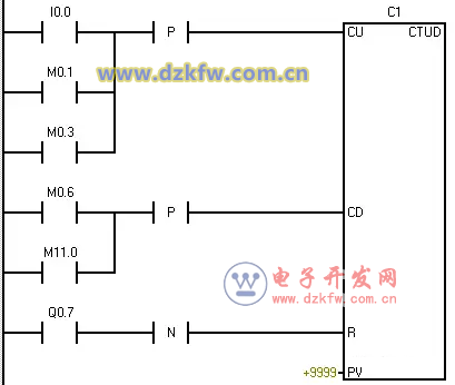 在此程序功能塊的輸入端“CU”處每輸入一個脈沖信號,對計數器加1;輸入端“CD”處每輸入一個脈沖信號,即對計數器加1;輸入端“R”處每輸入一個脈沖信號,即對計數器清零。