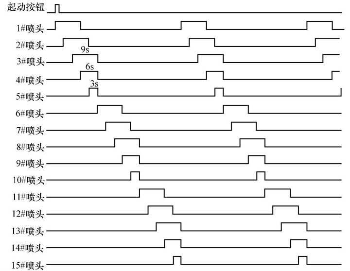 2)本實驗15個噴頭分成3組,每組5個按順序起停,3個組的工作過程都是一樣的,如圖3-54所示。
