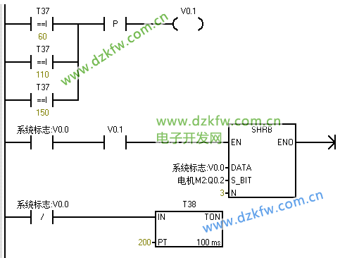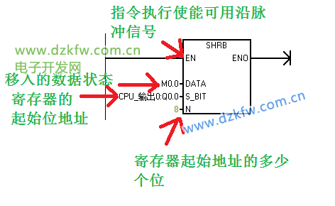 但N若為正數(shù),位移動(dòng)表示從低位開(kāi)始;若為負(fù)數(shù),表示從高位開(kāi)始移動(dòng) 移位寄存器位指令將 DATA 的位值移入移位寄存器。S_BIT 指定移位寄存器最低有效位的位置。N 指定移位寄存器的長(zhǎng)度和移位方向(正向移位 = N,反向移位 = -N)。 將 SHRB 指令移出的每個(gè)位值復(fù)制到溢出存儲(chǔ)器位 SM1.1 中。 移位寄存器位由最低有效位 S_BIT 位置和長(zhǎng)度 N 指定的位數(shù)定義。