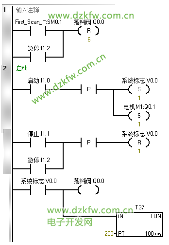 下面通過(guò)一個(gè)小案例來(lái)說(shuō)明移位寄存器指令的應(yīng)用。 如下圖所示為多級(jí)傳送帶的控制示意圖,控制要求如下:(1)落料閥打開(kāi)后,傳送電機(jī)M1馬上打開(kāi),延時(shí)6S后電機(jī)M2啟動(dòng)(2)電機(jī)2 啟動(dòng)后延時(shí)5S啟動(dòng)電機(jī)M3 ;電機(jī)M3啟動(dòng)后延時(shí)4S啟動(dòng)電機(jī)M4(3)若按下停止按鈕,落料閥需關(guān)閉,但為了防止物料累積,需根據(jù)各級(jí)傳送帶傳送的時(shí)間差別分別將4臺(tái)電機(jī)停止。(4)落料閥關(guān)閉6S后停止電機(jī)M1,5S后停電機(jī)M2, 4S后停電機(jī)M3,3S后停電機(jī)M4(5)按下緊急按鈕,所有輸出都要停止