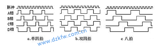 四相步進電機通過給四個定子線圈通電順序和時間的不同,從而形成強度和方向不同的旋轉磁場,吸引轉子以不同方向和速度旋轉。按照通電順序的不同,可分為單四拍、雙四拍、八拍三種工作方式。單四拍與雙四拍的步距角相等,但單四拍的轉動力矩小。八拍工作方式的步距角是單四拍與雙四拍的一半,因此,八拍工作方式既可以保持較高的轉動力矩又可以提高控制精度。本文介紹的就是八拍驅動的方法。