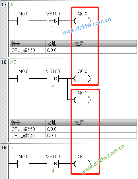 解決方法就是使用一組中間繼電器來作為8拍的輸出,再用這些中間繼電器去控制真正的輸出ABCD四相的線圈。
