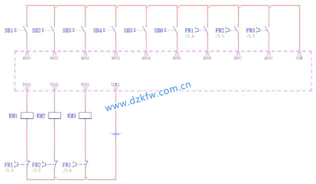3臺(tái)電動(dòng)機(jī)每臺(tái)需要啟動(dòng)、停止按鈕各一個(gè),需要占用PLC6個(gè)輸入點(diǎn)。