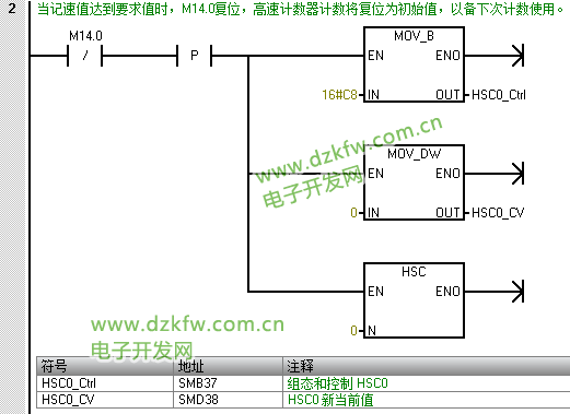上述程序注解:當記速值達到要求值時,M14.0復位,高速計數器計數將復位為初始值,以備下次計數使用。