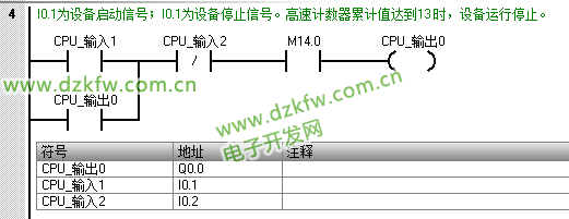 上述程序注解:I0.1為設備啟動信號;I0.1為設備停止信號。高速計數器累計值達到13 時,設備運行停止。