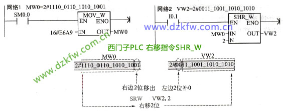 (2)右移指令SHR_W 對于右移指令,按指定位數(N)對源操作數(IN)依次右移N位,右邊移出位自然丟失,左邊空缺位補0,并將移位結果保存在目的操作數(OUT)中,源操作數(IN)保持不變。應用示例如圖3-5所示。
