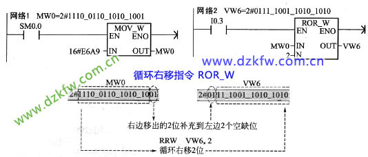 (4)循環右移指令 對于循環右移指令,按指定位數(N)對源操作數(IN)依次循環右移N位,右邊移出位補充到左邊空缺位,并將移位結果保存在目的操作數(OUT)中,源操作數(IN)保持不變。應用示例如圖3-7所示。