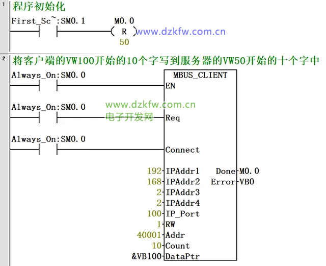 1、將客戶端的VW100開始的10個字寫到服務器的VW50開始的十個字中。