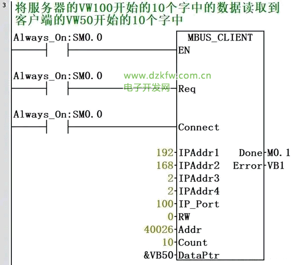 2、將服務器的VW100開始的10個字中的數據讀取到客戶端的VW50開始的10個字中。
