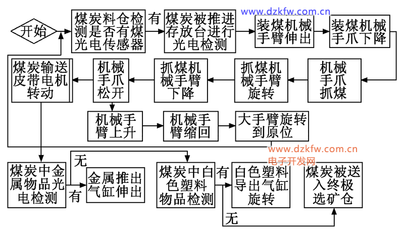 隨著制造業自動化程度的不斷發展,煤炭的輸送過程控制也逐漸實現了自動化。為了減少因多機械造成的井下安全隱患,提高礦井中的作業效率,就需要將煤炭的挖掘、輸送及分揀有機地結合起來。通過分析與考察,本文提出一種新型的煤炭輸送機的控制系統設計方案,此裝置包括裝煤機械手、煤炭帶式傳輸裝置及觸摸顯示裝置等。利用西門子S7-200 PLC編程軟件,結合氣動裝置、光電傳感器、變頻器、步進電機等實現了裝煤機械手的驅動,進而實現了煤炭的準確有效傳輸,并可以根據工位的需要調節傳感器及限位開關的位置。